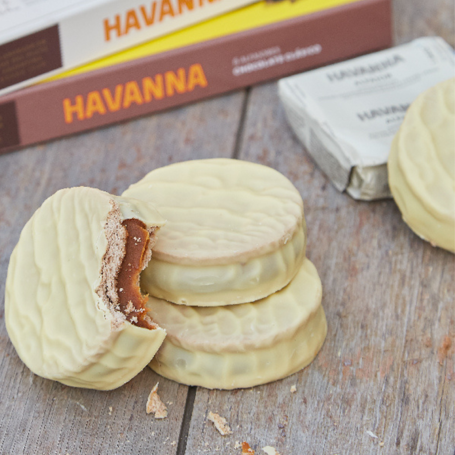 Galletitas rellenas con mucho dulce de leche y cubiertas con el más puro chocolate blanco.